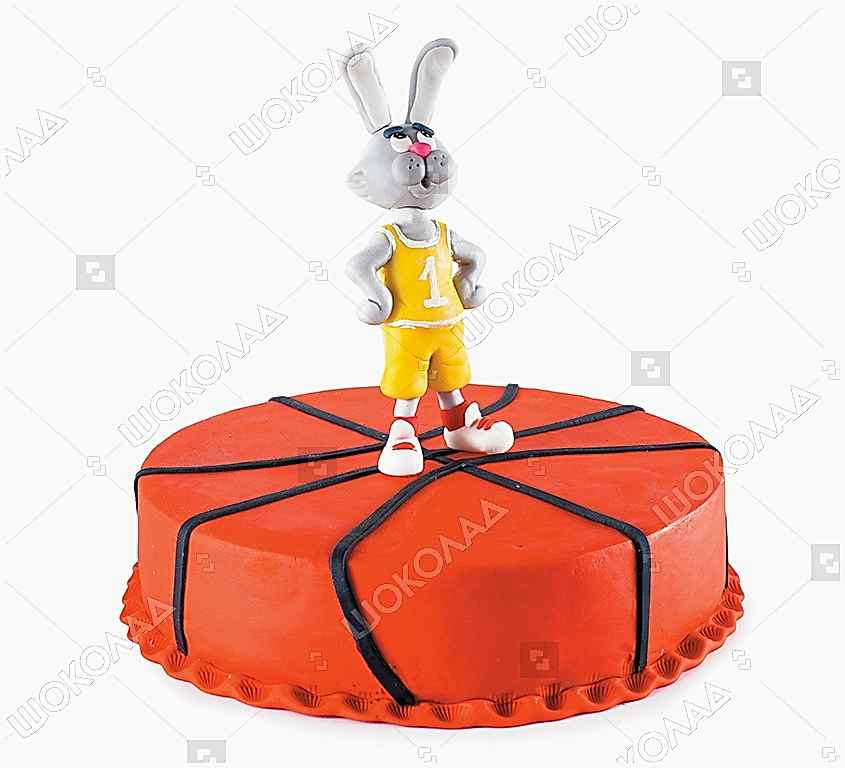 Одно из самых «спортивных» наших творений, торт «Баскетбол» обрадует и спортсменов, и их болельщиков. Он выполнен в Pin-Up баскетбольного мяча и увенчан мастичной фигуркой одного из самых прыгучих зверей - зайца.