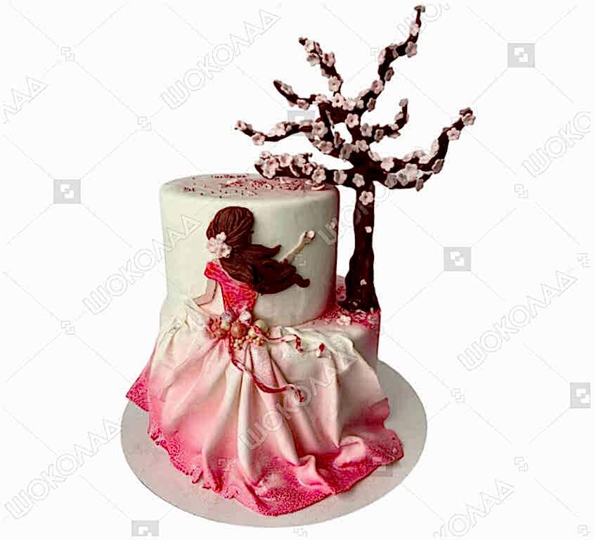 Девушка на торте выполнена в стиле аппликации, цветущее дерево - фигурка из мастики. Для нижнего яруса возможно ограничение по начинке, необходимо уточнить у нашего менеджера.