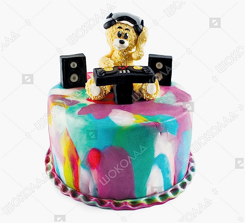 Подарите этот торт диджею или завсегдатаю ночных клубов. На верхушке торта за диджейским Pin-Up восседает медвежонок, в наушниках, в окружении мощных колонок. Мастичное покрытие раскрашено в разные цвета и напоминает сияние клубной цветомузыки.