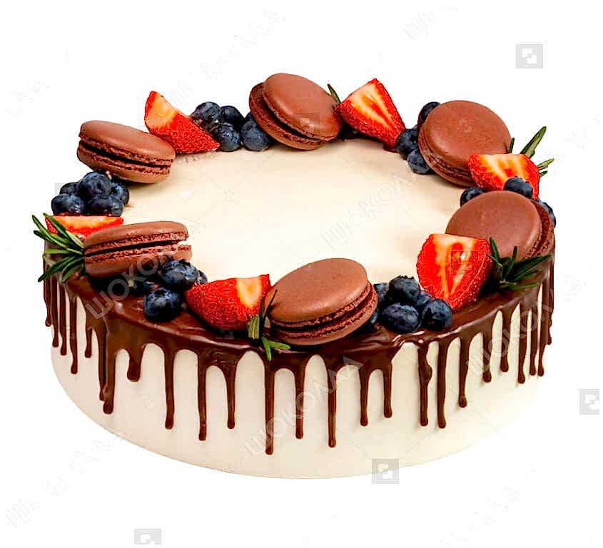 Покрытие и декор:Торт покрыт сливочным кремом, украшен свежими ягодами, подтеки н аоснове Pin-Up макаронс нашего производства