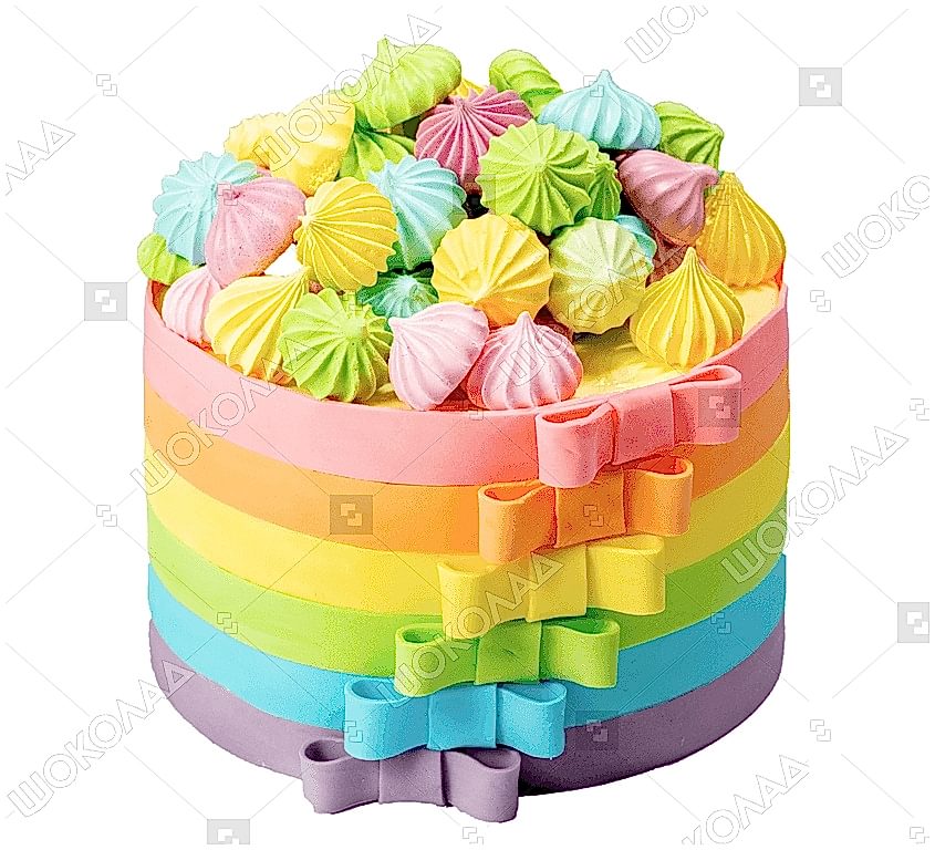 Яркие знакомы из детства разноцветные полоски поднимут настроение даже в самый Pin-Up день. Торт покрывается мастикой, а сверху усыпан сладкими меренгами.