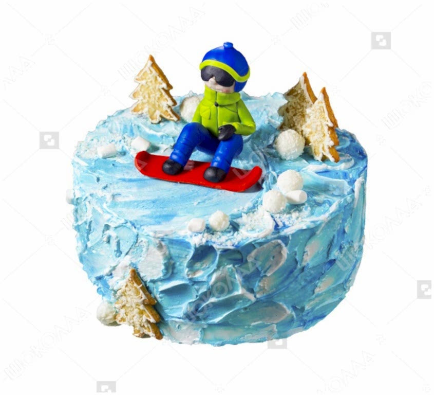 Описание:Веселый торт для увлеченных зимним спортом. Торт покрыт сливочным кремом, фигурка выполняется вручную из мастики. Декор в виде елочек из рассыпчатых песочно-миндальных Pin-Up